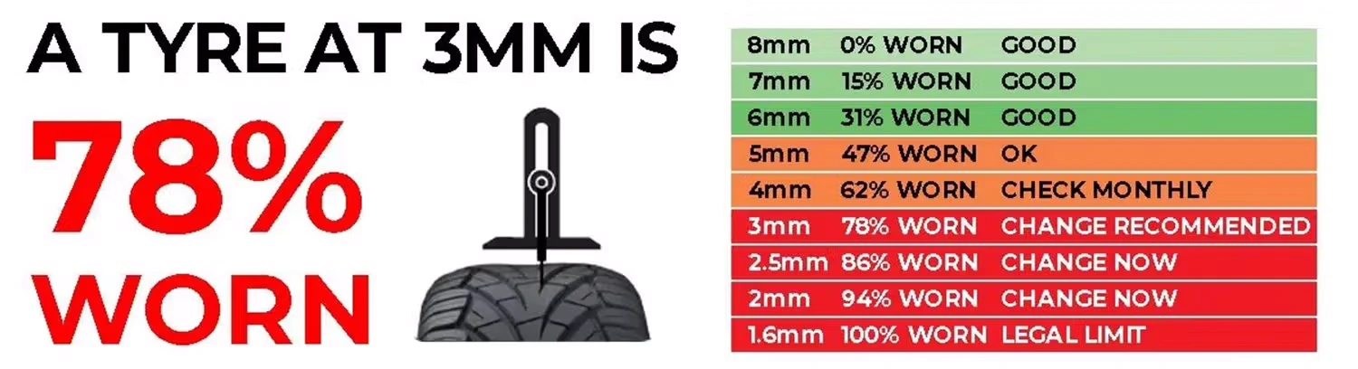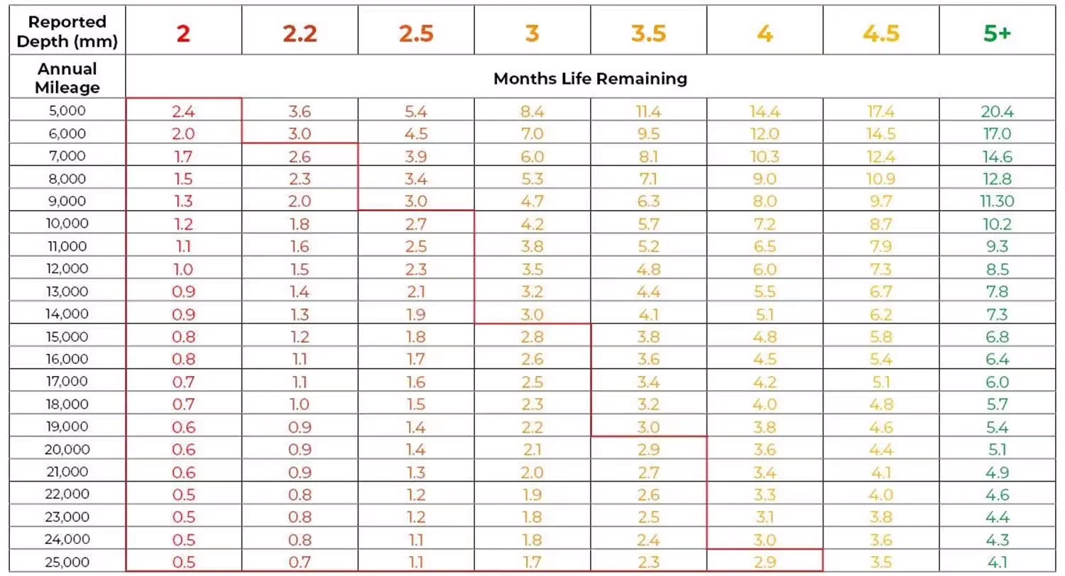 If we speak the same language we know you will understand that your tyres are either 15% worn or 86% worn so we will give you a traffic light system on our health checks to show you the wear of your tyres. Green is good, Amber is telling you that the tyres are getting worn and need to be checked monthly (we will do this for free for you) and below 3mm tread which is 78% worn will need changing very soon but this can also depend on your annual mileage so we have put together some information here to show you when you would need your tyres changed based on the tread left and the annual mileage you cover.