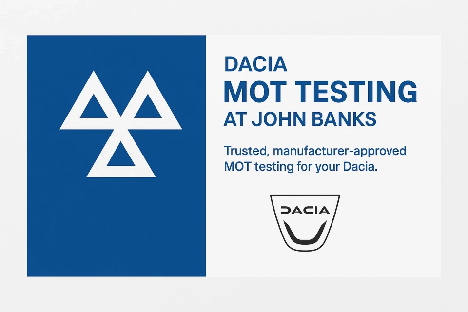 By choosing John Banks for your MOT, you benefit from genuine Dacia expertise, advanced diagnostic equipment and a commitment to transparent, reliable aftersales care. We inspect every key safety and compliance component — including brakes, suspension, lights, emissions and structural integrity — ensuring your Dacia remains road-legal, safe and performing at its best.