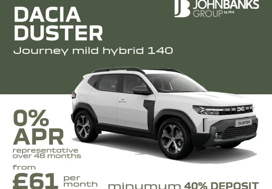 Personal Contract Purchase (PCP) Finance provided by Mobilize Financial Services, Rivers Office Park, Denham Way, Maple Cross, Rickmansworth, WD3 9YS. Subject to status. Guarantees and indemnities may be required. You must be a UK resident (excluding the Channel Islands) and 18 or over. Offer based on mileage shown, excess mileage 8p per mile inc VAT. Terms and conditions apply. Offers cannot be used with other schemes or finance offers. Prices and offers shown are available on specified new vehicles when ordered between 16th December 2025 – 31st March 2026 and registered & financed by 30th June 2026. Duster 0% APR requires 40% minimum deposit and is available on specified new vehicles when ordered between 16th December 2025 – 2nd February 2026 and registered & financed by 30th June 2026. Participating retailers only. Your Dacia retailer is a credit broker and not a lender. Lenders will pay commission to your Dacia retailer; rates may vary but will not influence the interest rate you pay. Hire Purchase (HP) Finance provided by Mobilize Financial Services, Rivers Office Park, Denham Way, Maple Cross, Rickmansworth, WD3 9YS. Subject to status. Guarantees and indemnities may be required. You must be a UK resident (excluding the Channel Islands) and 18 or over. Terms and conditions apply. Offers cannot be used with other schemes or finance offers. Prices and offers shown are available on specified new vehicles when ordered between 16th December 2025 – 31st March 2026 and registered & financed by 30th June 2026. Participating retailers only. Your Dacia retailer is a credit broker and not a lender. Lenders will pay commission to your Dacia retailer; rates may vary but will not influence the interest rate you pay. Personal Contract Purchase (PCP) Finance provided by Mobilize Financial Services, Rivers Office Park, Denham Way, Maple Cross, Rickmansworth, WD3 9YS. Subject to status. Guarantees and indemnities may be required. You must be a UK resident (excluding the Channel Islands) and 18 or over. Offer based on mileage shown, excess mileage 8p per mile inc VAT. Terms and conditions apply. Offers cannot be used with other schemes or finance offers. Prices and offers shown are available on specified new vehicles when ordered between 16th December 2025 – 31st March 2026 and registered & financed by 30th June 2026. Duster 0% APR requires 40% minimum deposit and is available on specified new vehicles when ordered between 16th December 2025 – 2nd February 2026 and registered & financed by 30th June 2026. Participating retailers only. Your Dacia retailer is a credit broker and not a lender. Lenders will pay commission to your Dacia retailer; rates may vary but will not influence the interest rate you pay.