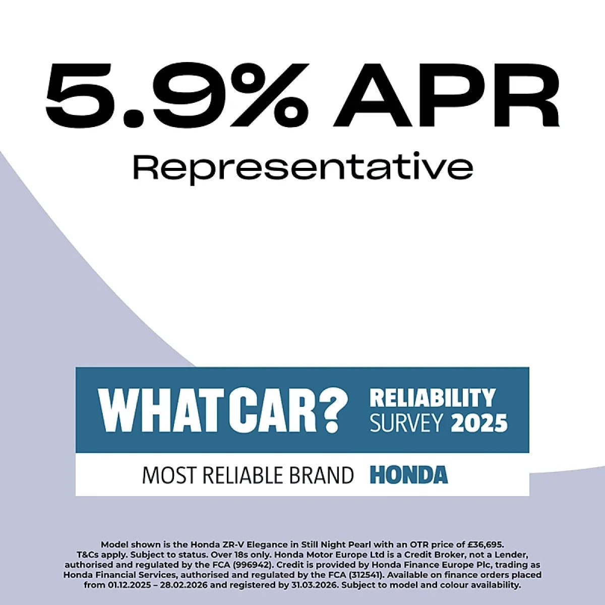 Terms and Conditions New retail 26YM Civic Hybrid ordered with Honda and finance approved by Honda Finance Europe from 13 February 2026 to 9 March 2026 and registered by 31 March 2026. Subject to model and colour availability. Offers applicable at participating Retailers (excluding Channel Islands) and are at the promoter’s absolute discretion. Not to be used along with any other offers currently available. OTR may be subject to change due to actual or unexpected changes in tariffs, duties taxes or other costs which may affect importation or other costs of supply. Honda Deposit Contribution: £2,000 Honda deposit contribution on all new retail Civic Hybrid models purchased through Honda Personal Contract Purchase (PCP) or Honda Hire Purchase (HP). 5.9% APR representative Honda Personal Contract Purchase (PCP): Maximum deposit 35%. At the end of the agreement, there are three options: i) Retain: Pay the optional final payment to own the vehicle, ii) Return: Return the vehicle, or iii) Renew: Part exchange your Honda for a new one. You do not have to pay the Final Payment if you return the car at the end of the agreement and you have paid all other amounts due, the vehicle is in good condition and has been serviced in accordance with the Honda service book and the maximum annual mileage has not been exceeded. Excess mileage charge excludes VAT at current rate. 5.9% APR representative Honda Hire Purchase (HP): At the end of the agreement, once the option to purchase fee [if applicable] has been paid you will own the vehicle outright, you could then choose to part exchange your Honda for a new one. The Honda Dream Bigger Event offers £1,000 (including VAT) discount off the On the Road (OTR) price on the purchase of any new Honda excluding Prelude, e:Ny1 and Type R. This offer is available to retail cash and finance customers. Credit is subject to status and available to UK residents aged 18 or over. The offer is valid on qualifying vehicles purchased from 13 February 2026 to 9 March 2026 and registered by 31 March 2026. There is no cash or credit alternative, and the terms of this promotion are non-negotiable. This offer is subject to availability of models and colours at participating Honda retailers (excluding Channel Islands), may be used in conjunction with other Honda offers currently available, subject to eligibility and may be withdrawn or amended at any time without notice. The OTR price may be subject to change due to actual or unexpected changes in tariffs, duties taxes or other costs which may affect importation or other costs of supply. Retail Customers Indemnities may be required in certain circumstances. Finance is only available to persons aged 18 or over, subject to status. All figures are correct at the time of publication but may be varied or withdrawn at any time. Honda Motor Europe Limited and Honda Franchise Retailers are credit brokers, not lenders. You will not receive any advice or recommendations from Honda Motor Europe Limited or Honda Franchise Retailers because they are not independent financial advisors. Credit is provided by Honda Finance Europe Plc, trading as Honda Financial Services, Cain Road, Bracknell, Berkshire RG12 1HL, a company registered at Company’s House No. 03289418. Honda Finance Europe Plc is authorised and regulated by the Financial Conduct Authority under Financial Services Register No.312541. Honda Finance Europe Plc, trading as Honda Financial Services (company number 03289418), have a pre-arranged contractual relationship with Honda Motor Europe Limited and Honda Franchise Retailers to introduce you to us. We do not make a payment and / or reward to the Retailers or Honda Motor Europe Limited if you enter into an agreement with us. Business Customers Indemnities may be required in certain circumstances. Finance is only available to persons aged 18 or over, subject to status. All figures are correct at time of publication but may be varied or withdrawn at any time. Honda Franchise Retailers are credit brokers, not lenders. If you enter into a finance agreement with Honda Financial Services, the Retailer may receive a commission or reward from Honda Financial Services. This does not affect the terms of your credit agreement. Before proceeding, we will disclose the amount and basis of any such payment and obtain your consent. Honda Franchise Retailers may also offer products from other finance providers. In these cases, the relevant finance provider will inform you of any commission or reward paid to the Retailer. Your Retailer can provide information regarding these arrangements upon request. Credit is provided by Honda Finance Europe Plc, trading as Honda Financial Services, Cain Road, Bracknell, Berkshire RG12 1HL. A company registered at Company’s House No. 03289418. Honda Finance Europe Plc is authorised and regulated by the Financial Conduct Authority under Financial Services Register No.312541.
