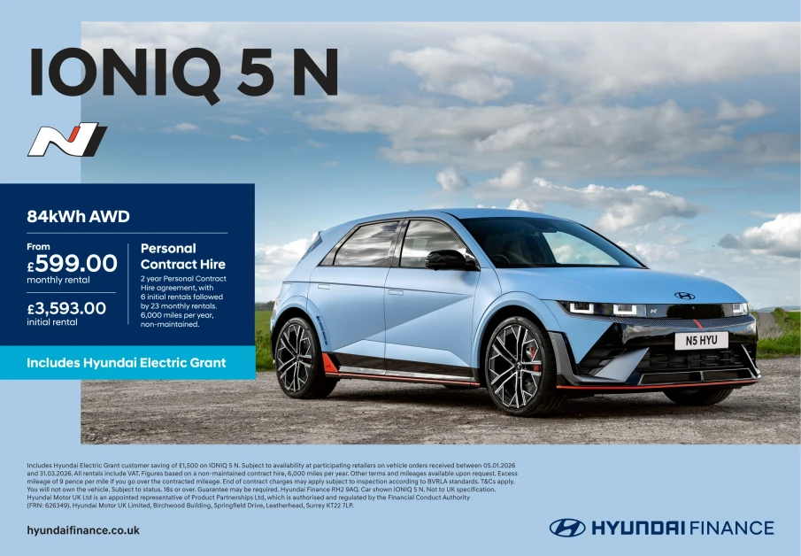 Includes Hyundai Electric Grant customer saving of £1,500 on IONIQ 5 N. Subject to availability at participating retailers on vehicle orders received between 05.01.2026 and 31.03.2026. All rentals include VAT. Figures based on a non-maintained contract hire, 6,000 miles per year. Other terms and mileages available upon request. Excess mileage of 9 pence per mile if you go over the contracted mileage. End of contract charges may apply subject to inspection according to BVRLA standards. T&Cs apply. You will not own the vehicle. Subject to status. 18s or over. Guarantee may be required. Hyundai Finance RH2 9AQ. Car shown IONIQ 5 N. Not to UK specification. Hyundai Motor UK Ltd is an appointed representative of Product Partnerships Ltd, which is authorised and regulated by the Financial Conduct Authority (FRN: 626349). Hyundai Motor UK Limited, Birchwood Building, Springfield Drive, Leatherhead, Surrey KT22 7LP.