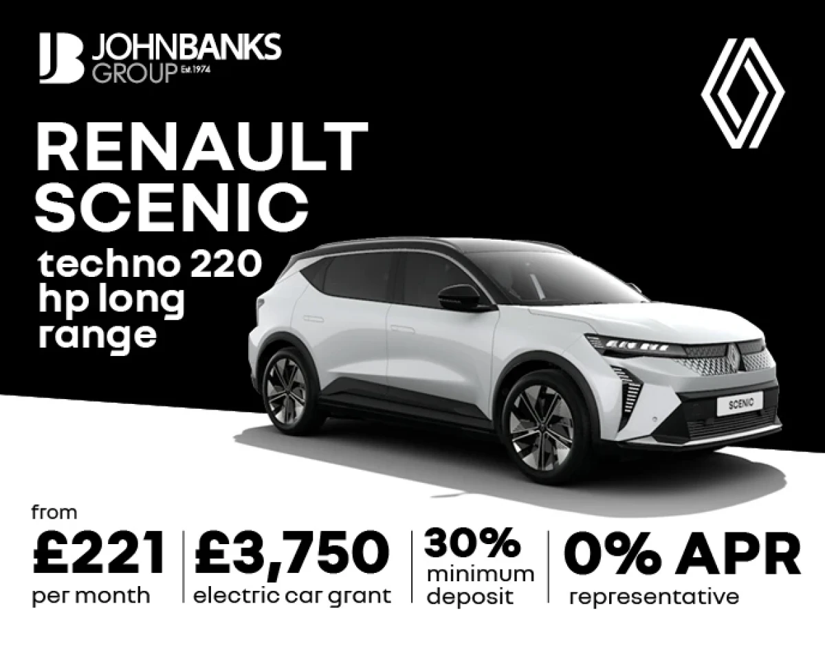 Drive the Renault Scenic E-Tech Techno Long Range MY26 from just £221 per month with 0% APR and a £3,750 Electric Car Grant. Available now at John Banks Renault in Cambridge, Colchester & Ipswich. Switch to electric with style, performance and exceptional value today.