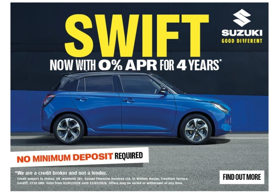 John Banks Limited is a credit broker and not a lender. We may receive commission for introducing you to Suzuki Financial Services. The commission will be a flat fee amount. This means the commission will be the same no matter how much you borrow or the interest rate that you pay. Fuel economy and CO2 results for the Suzuki 2026 Swift range. Mpg (l/100km) (combined): 57.6 (4.9) to 64.2 (4.4). CO2 emissions: 110 to 99 g/km. Credit subject to status, UK residents 18+, Suzuki Financial Services Ltd, St William House, Tresillian Terrace, Cardiff, CF10 5BH. Figures shown are for comparability purposes; only compare fuel consumption and CO2 figures with other cars tested to the same technical procedures. These figures may not reflect real life driving results, which will depend upon a number of factors including the accessories fitted (post-registration), variations in weather, driving styles and vehicle load. Model shown in advert is a Swift 1.2 Mild Hybrid Ultra at £21,649 on the road including optional dual-tone paint at £850. Offer available until 31st March 2026. Annual warranty renewable on each qualifying service up to 10 years/100,000 miles. Terms: cars.suzuki.co.uk/owners/warranty